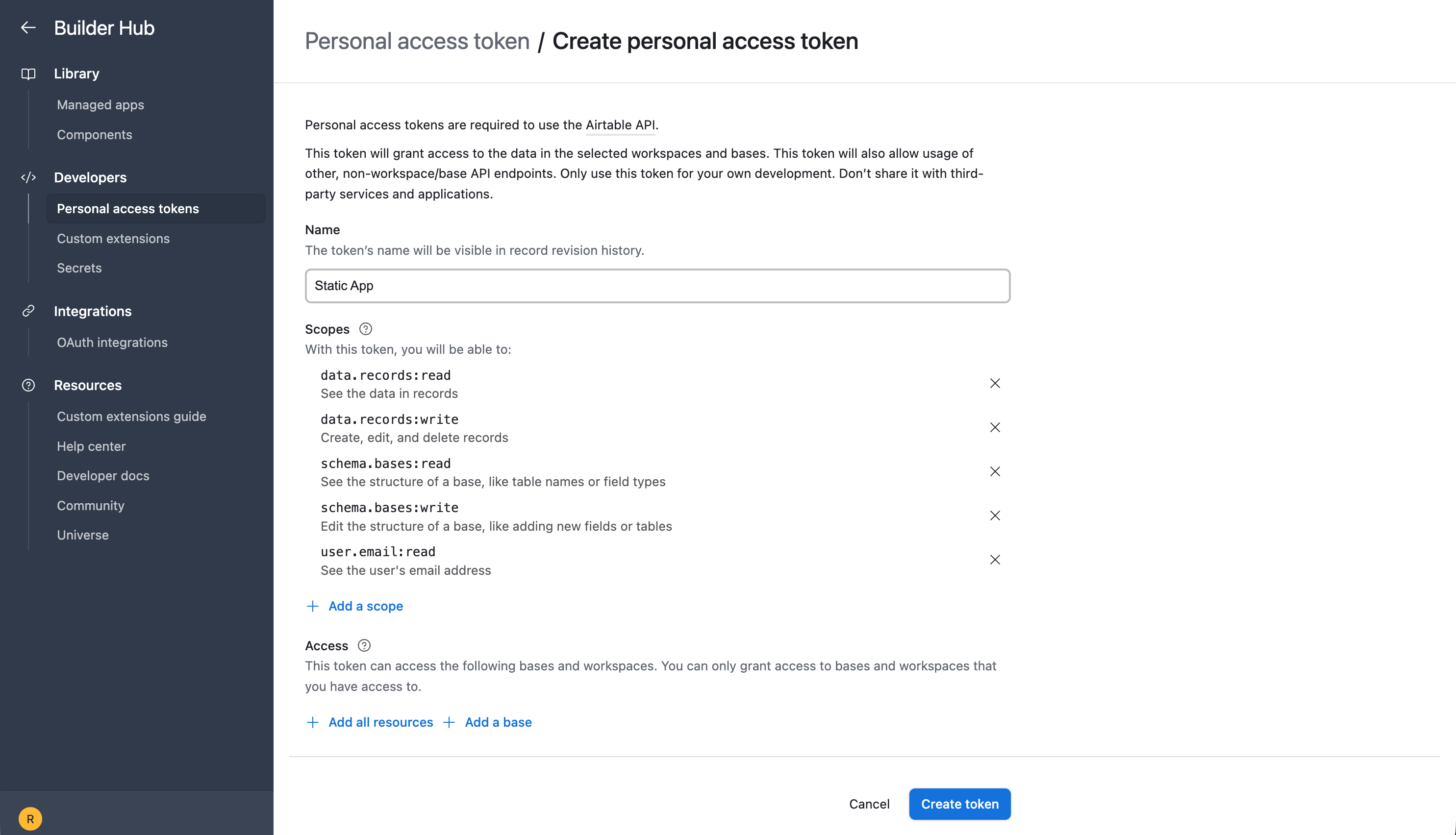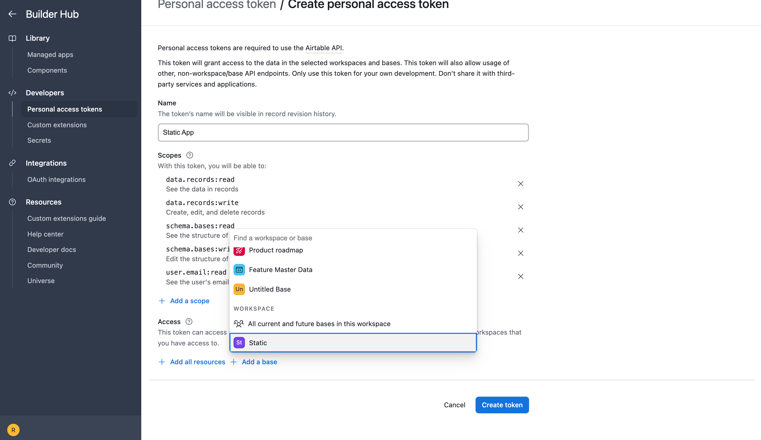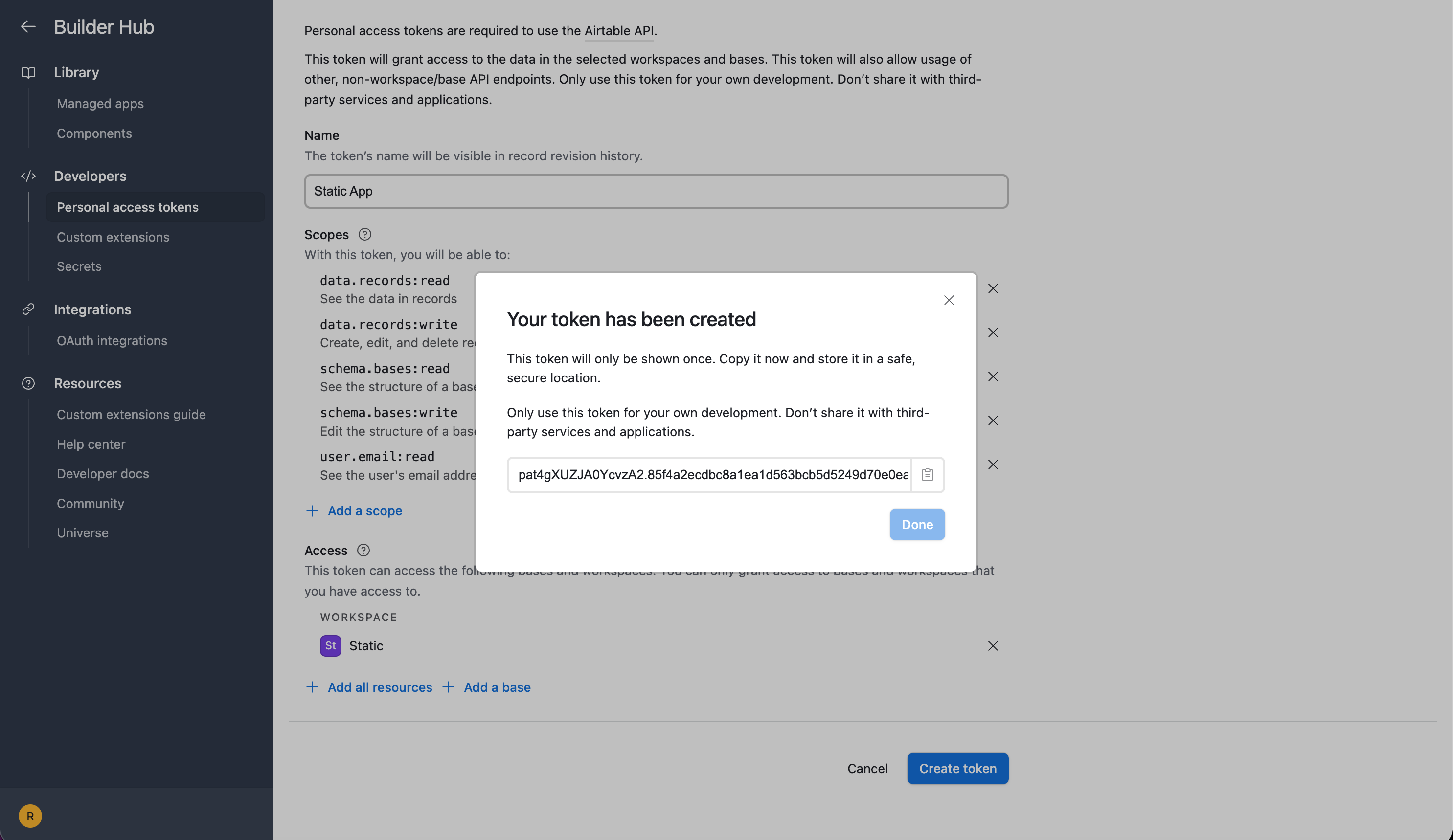 - Click the "Add Integration" button on Static.app and paste the Airtable token here.